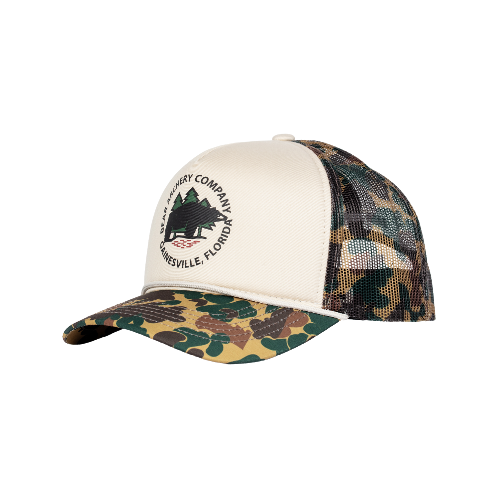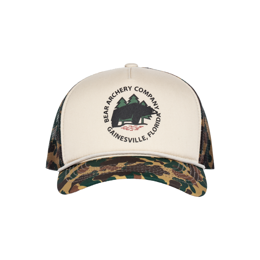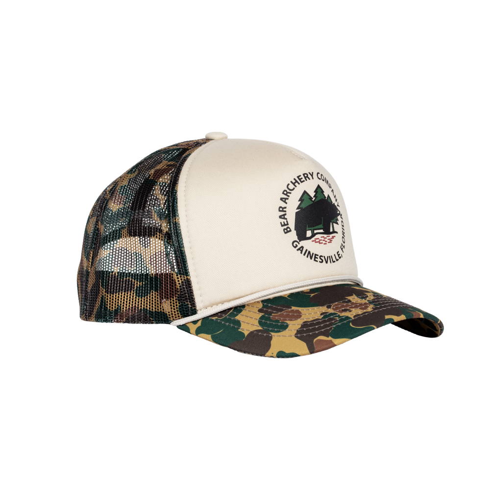 Celebrate the rich history of archery and Fred Bear with this timeless trucker hat. Showcasing the legendary Fred Bear Camo and the classic Bear Archery Traditional Bowhunting logo, its designed for archers and outdoor enthusiasts who honor the history and heritage of the sport. Crafted with embroidered details and an adjustable strap, this traditional trucker hat ensures all-day comfort without compromising style. Whether on the trail or in everyday life, its perfect for hunts, outdoor adventures, or simply carrying the spirit of archery wherever you go.