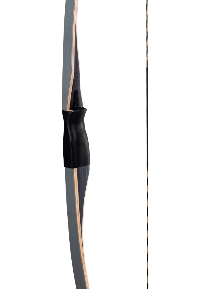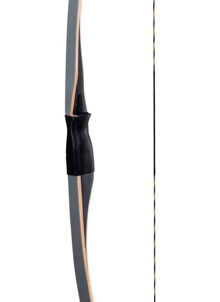 The black Hard-Rock Maple riser features limbs overlaid with clear white maple, and backed and faced with high strength black fiberglass. The tips are handcrafted and layered with black and white fiberglass. The leather “shoot off the shelf” arrow rest allows for clean arrow flight.