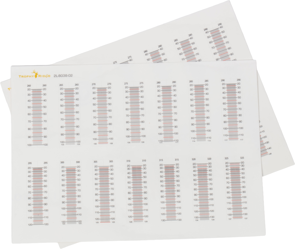 Achieve consistent, to the yard accuracy with Trophy Ridge Sight Tapes. This pack includes 8 sheets of sight tapes, featuring 4 pages of vertical tapes and 4 pages of wheel tapes. Available in right- or left-hand packs, these self-adhesive, weather resistant tapes are a universal fit for most vertical mover sights. The tapes are calibrated for precision at multiple distances. Vertical tapes start at 20 yards (190325 FPS) and 40 yards (190325 FPS), while wheel tapes start at 20 yards (190325 FPS) and 40 yards (190325 FPS). Simply apply the tapes to your sight, sight in at 20 or 40 yards to establish your first point, then step out to longer distances to add a second point. Each tape also includes speed estimates to help you quickly select the right tape for your bow.