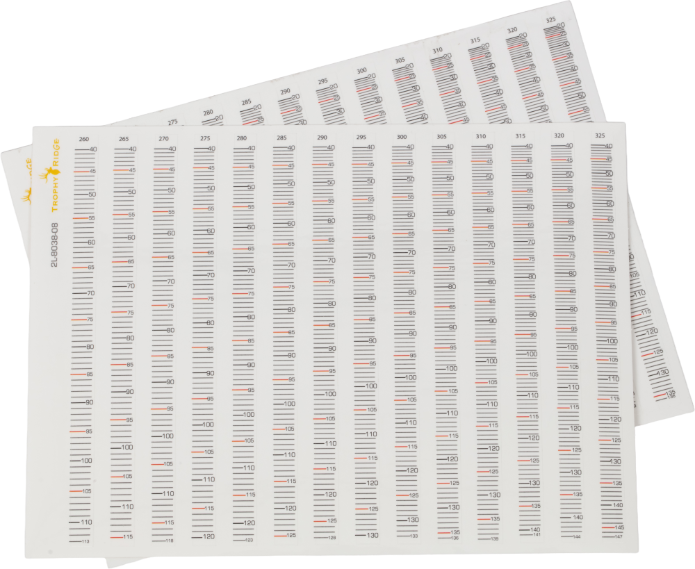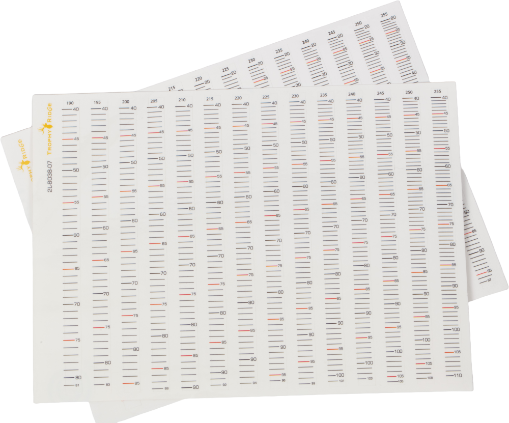 Includes yardage markings and speed estimates (190–325 FPS) to help select the right tape and fine tune your bow -